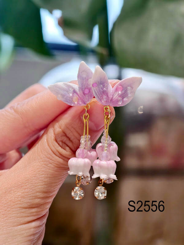 Delicate and dreamy, these lilac bellflower earrings bring fairy-tale charm to your jewelry collection. Sculpted from translucent clay and accented with sparkling crystals, these earrings resemble tiny blossoms swaying in the breeze. Lightweight and enchanting, they’re the perfect accessory for spring and summer styling.
