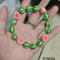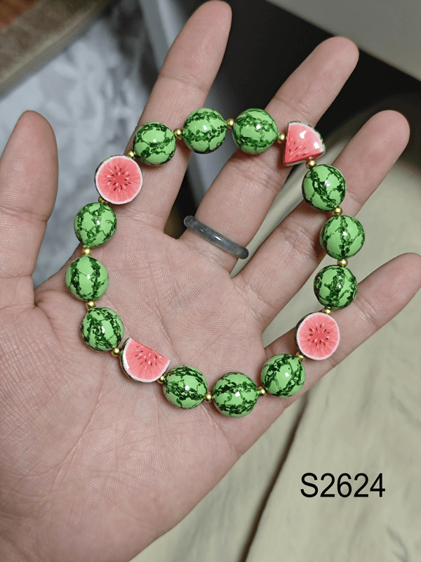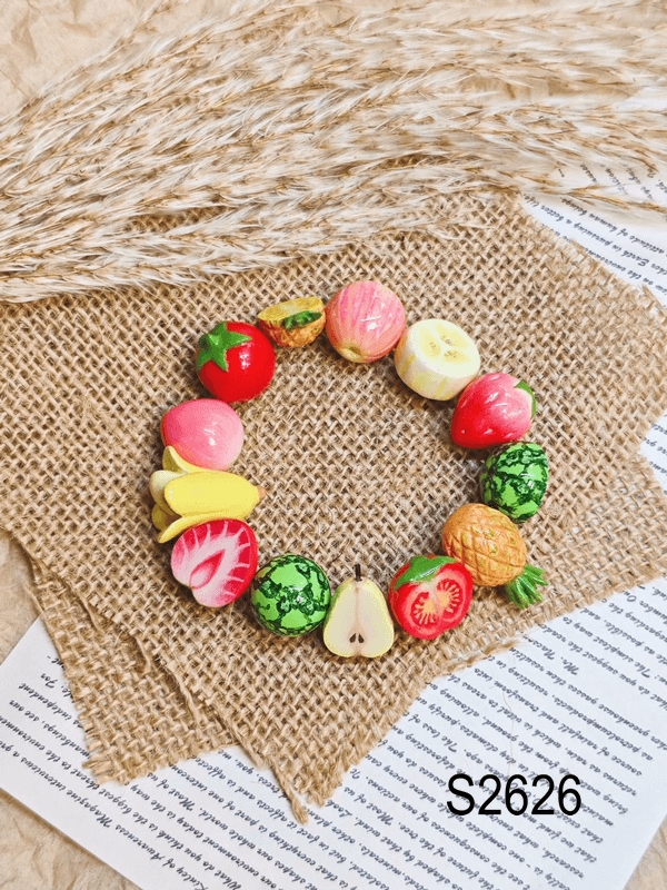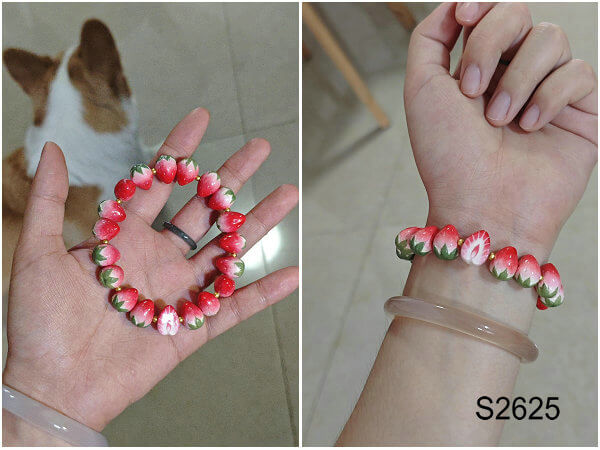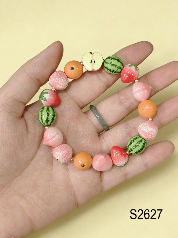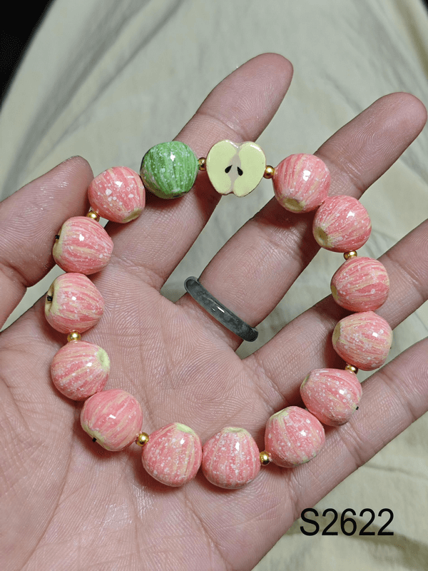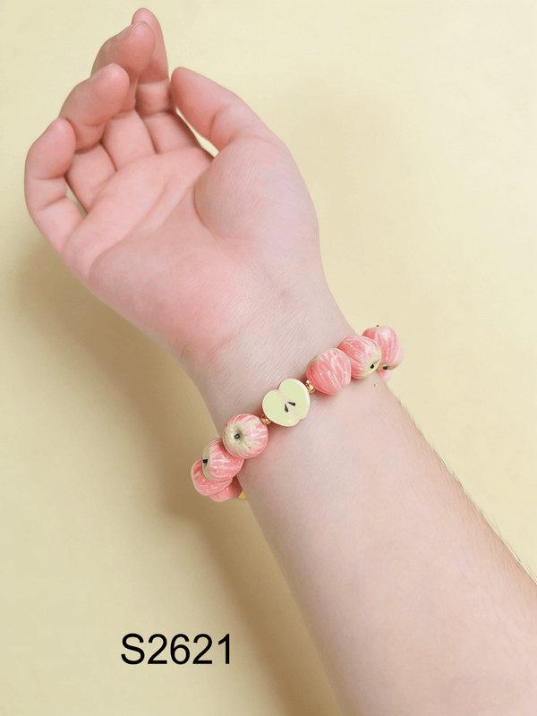 This adorable apple bracelet is carefully handmade from polymer clay, featuring miniature pink apples with delicate hand-painted details. Each bead is individually sculpted, making every bracelet slightly unique and full of personality.