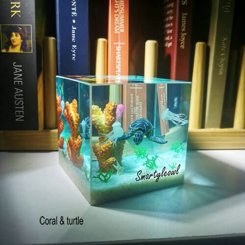 This amazing piece is made of epoxy resin, some style comes with a LED base. The deep diorama includes various marine life, starfish, and of course a seabed. In addition, it also has vivid waves on the surface in order to present a realistic ocean.
