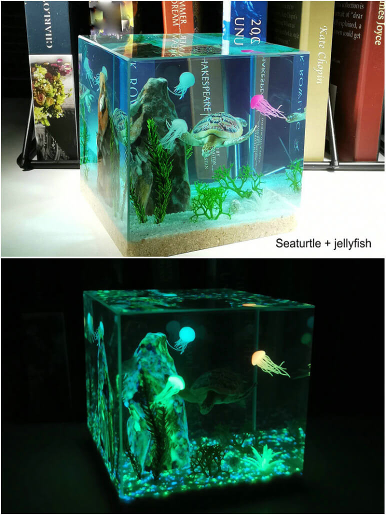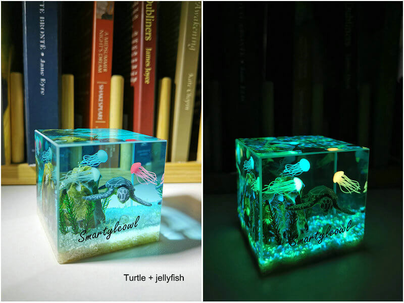 Ocean Resin Paperweight |Turtle Ocean Resin Diorama| Resin Cube| Jellyfish resin diorama| glow in the dark